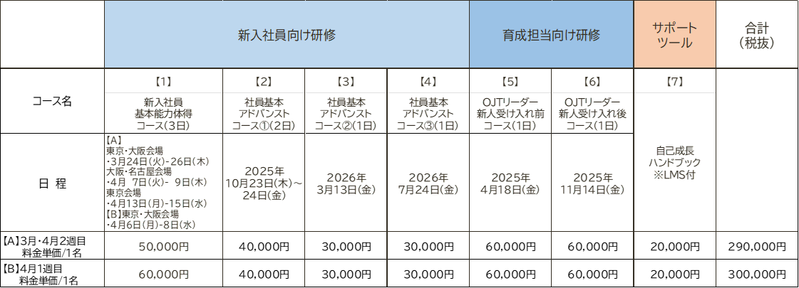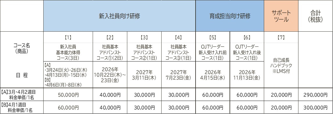 ・新入社員入社時研修の「【1】新入社員基本能力体得コース」は、お申込み時期により料金が変わります。